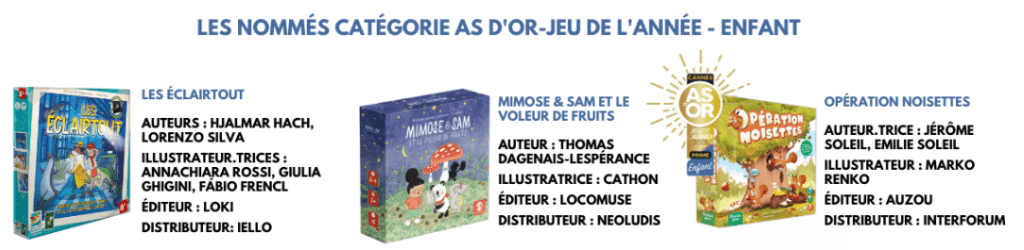 - As d’Or – Jeu de l’Année Enfant (As de Oro – Juego del Año para Niños): Esta categoría premia al mejor juego diseñado específicamente para niños. Busca resaltar juegos que brinden una experiencia enriquecedora para los jóvenes jugadores.