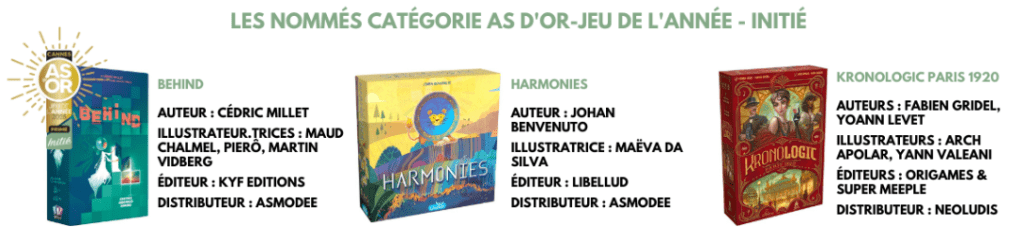 - As d’Or – Jeu de l’Année Initié (As de Oro – Juego del Año para Principiantes): Esta categoría se enfoca en juegos de nivel inicial o principiante.